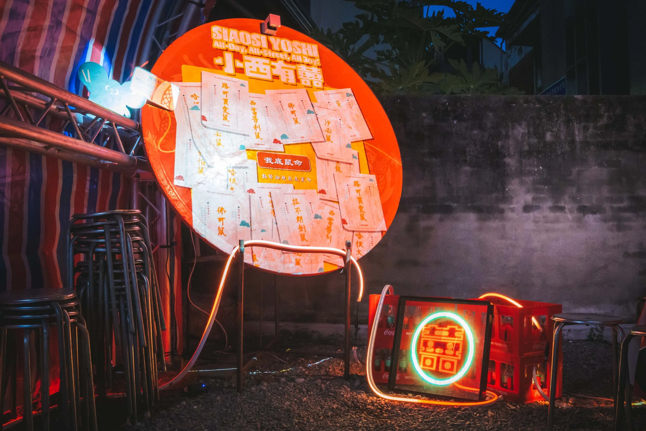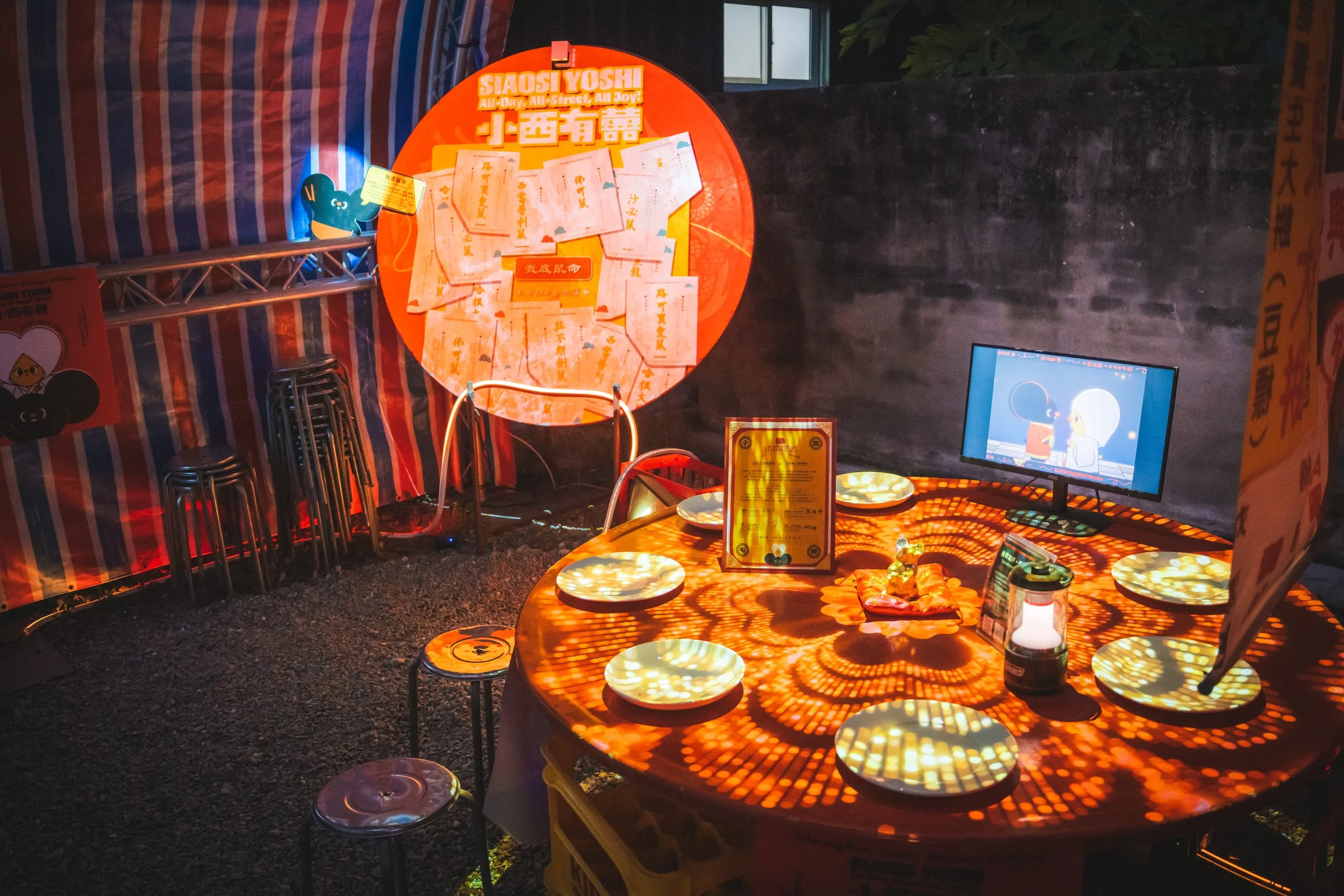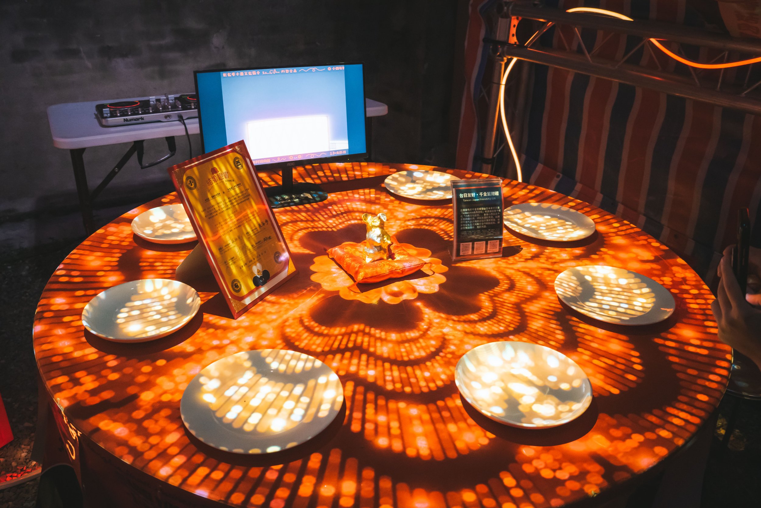彰化小西巷內錢鼠娶親,迎娶日本東京橘商店街的千金鼠,一場盛大的跨國婚禮,透過光雕及互動投影,打造又在地又國際的文化派對。